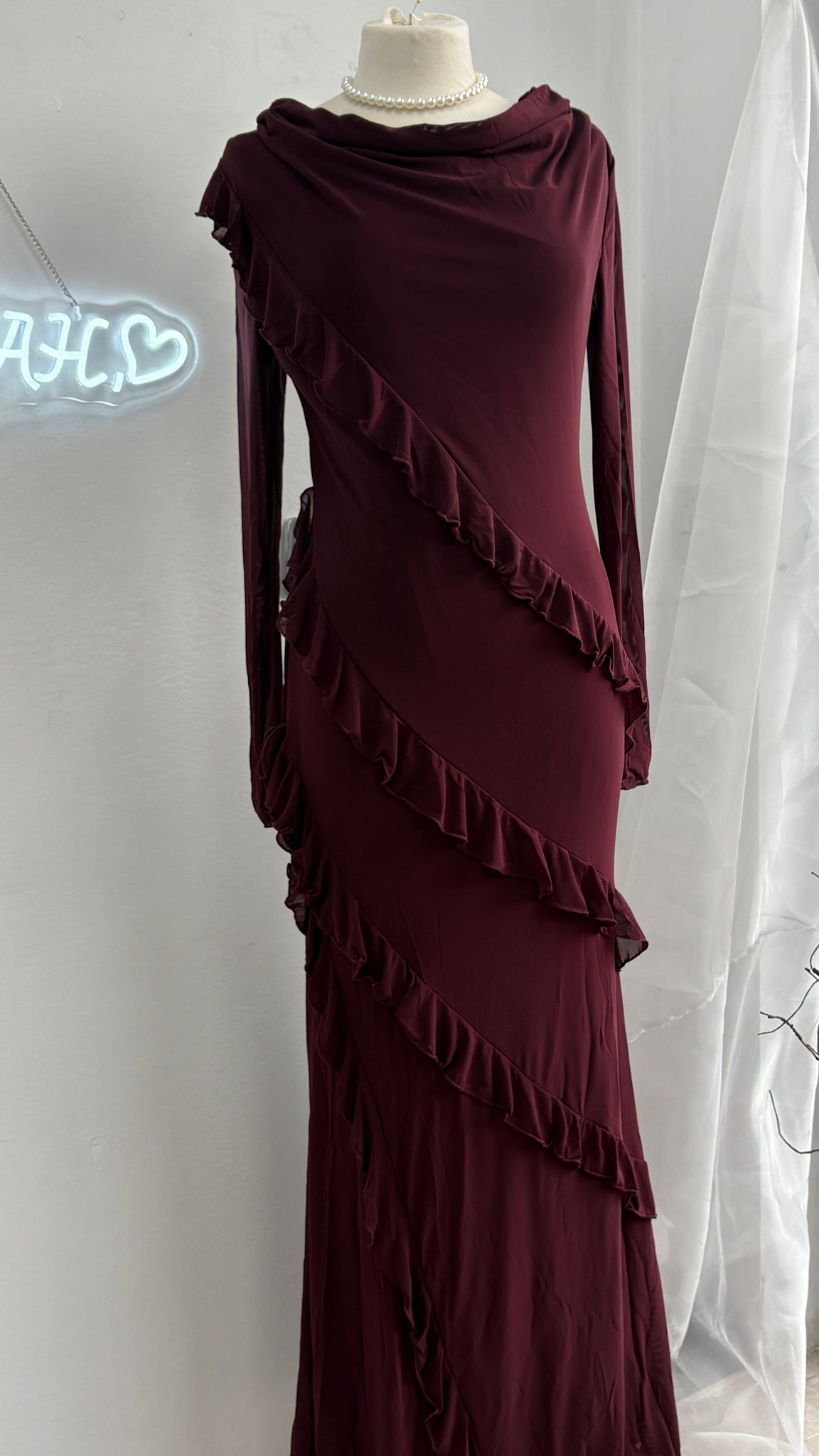 The Yusra dress in plum features a delicate ruffle detail, adding a touch of elegance to this airy, voluminous dress. Perfect for both casual and formal occasions, this dress is both versatile and stylish. Elevate your wardrobe with this must-have piece.